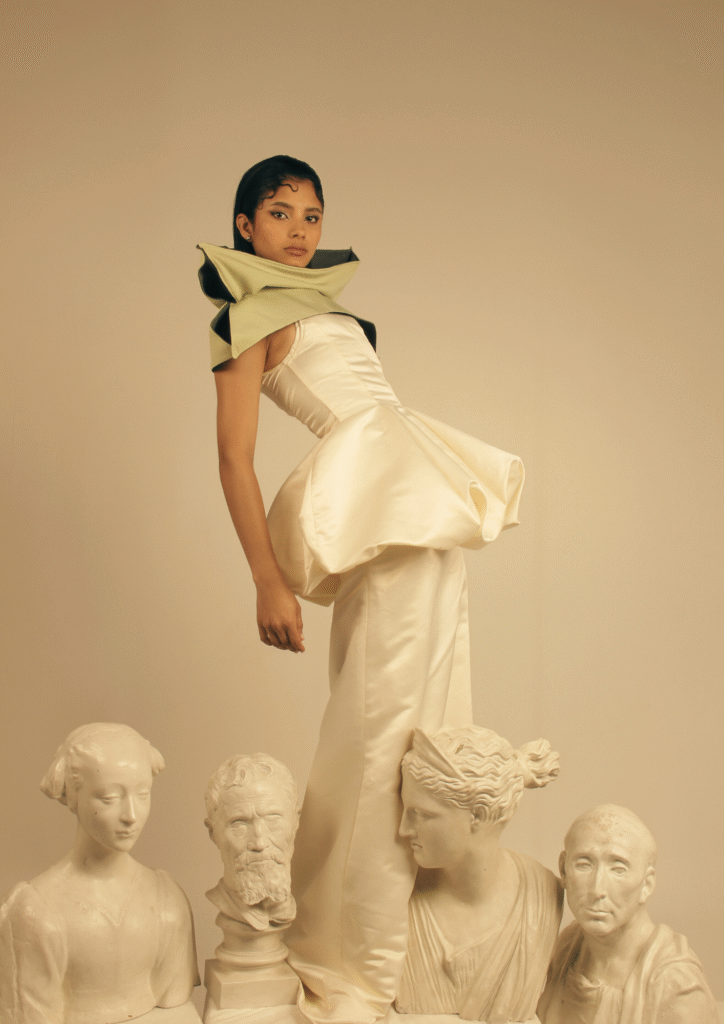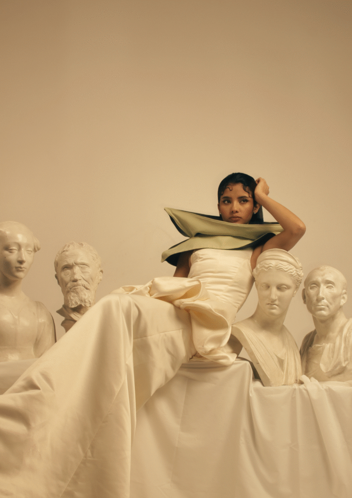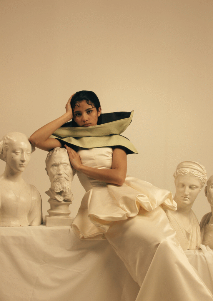 La colección presenta la soledad no como un vacío, sino como una fuerza transformadora. A través de siluetas que oscilan entre lo adherente y lo voluminoso, se genera un lenguaje visual que mezcla misterio y sensualidad. Los colores —marfiles, verdes y acentos cálidos— evocan la naturaleza y la profundidad emocional, mientras que los relieves y texturas representan la monumentalidad del mito.